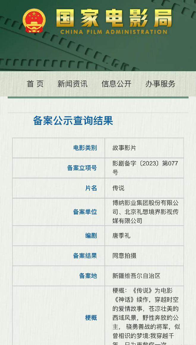 此前,国产精品无码久久AV亚洲精品亚洲人成人网国家电影局公示信息显示,电影《神话》的续作《传说》已正式备案,唐季礼编剧,继续讲述“穿越时空的爱情故事”。